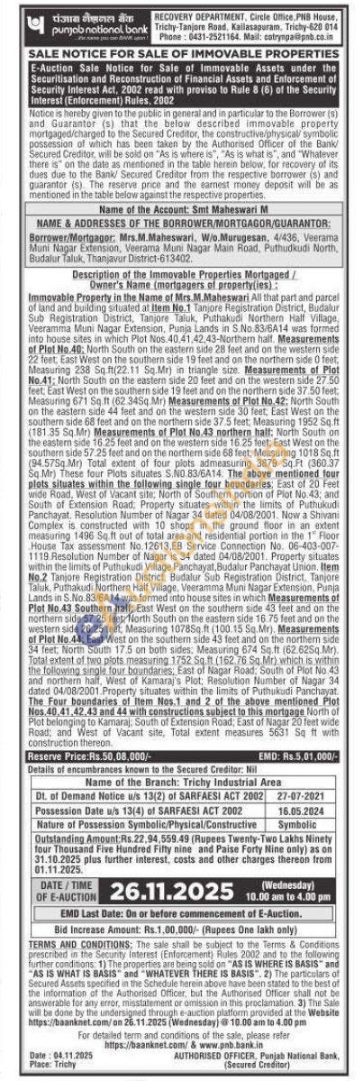 All that part and parcel of land and building situated at Item No.1 Tanjore Registration District, Badalur Sub Registration District, Tanjore Taluk, Puthakudi Northern Half Village, Veeramma Muni Nagar Extension, Punja Lands in S.No. 83/6A14 was formed into house sites in which Plot Nos. 40.41.42,43-Northern hall. Measurements of Plot No. 40; North South on the eastern side 28 foot and on the western side 22 feet, East West on the southern side 19 feet and on the northern side 0 feet, Measuring 238 Sq.ft(22.11 Sq.Mrj in triangle size Measurements of Plat No.41: North South South on on the the eastern eastern side 20 feet and on the westem side 27.60 feet: East West on the southern side 19 feet and on the northern side 37.50 feet. Measuring 671 Sq.ft (62.34Sq Mr) Measurements of Plot No.42: North South on the eastern side 44 feet and on the western side 30 feet, East West on the southern side 68 feet and on the northern side 37.5 feet, Measuring 1952 Sq.ft (161.35 Sq.Mr) Measurements of Plot No.43 northern halt: North South on the castem side 16.25 feet and on the western side 16.25 feet, East West on the southern side 57.25 feet and on the northem side 68 feet, Measuring 1018 Sq.ft (94.575q.Mr) Total extent of four plots admeasuring 3879 Sq.Ft (360.37 Sq Mr) These four Plots situates S.NO 83/6414. The above mentioned four plets situates within the following single four boundaries. East of 20 Feet wide Road, West of Vacant site, North of Southern portion of Plot No. 43, and South of Extension Road, Property situates within the limits of Puthukudi Panchayat. Resolution Number of Nagar 34 dated 04/08/2001. Now a Shivani Complex is constructed with 10 shops in the ground floor in an extent measuring 1496 Sq.ft out of total area and residential portion in the 1 Floor House Tax assessment No 12613.EB Service Service Connection No. 06-403-007-1119. Resolution Number of Nagar is 34 dated 04/08/2001. Property situates within the limits of Puthukudi Village Panchayat, Budalur Panchayat Union. Item No.2 Tanjore Registration District, Budalur Sub Registration District, Tanjore Taluk, Puthakudi Northern Half Village, Veeramma Muni Nagar Extension, Punja Lands in S.No. 83/6414 was formed into house sites in which Measurements of Plot No. 43 Southern half: East West on the southern side 43 feet and on the northern side 57.25 feet, North South on the eastern side 16.75 feet and on the western side 26.25 feet. Measuring 10785q.ft (100. 15 Sq.Mr) Measurements of Plot No.44: East West on the southem side 43 feet and on the northern side 34 feet North South 17.5 on both sides. Measuring 674 674 Soft (62.625g Mr. Total extent of two plots measuring 1752 Soft (162.76 Sg Mr) which is within the following single four boundaries, East of Nagar Road, South of Plot No. 43 and northern halt, West of Kamaraj's Plat, Resolution Number of Nagar 34 dated 04/08/2001. Property situates within the limits of Puthukadi Panchayat. The Four boundaries of Item Nos 1 and 2 of the above mentioned Plat Nos 40,41,42,43 and 44 with constructions subject to this mortgage North of Plot belonging to Kamaraj: South of Extension Road, East of Nagar 20 feet wide Road and West of Vacant site. Total extent measures 5631 Sq ft with construction thereon