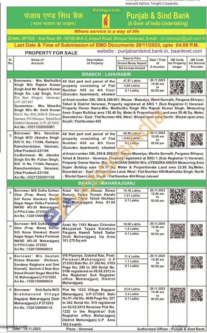 All that part and parcel of the property consisting of Flat Number 405 on 4th floor (Gurudev Apartment), situated at Arazi number 280, 289 & 289/401, Mauza - Mawaiya, Ward-Sarnath, Pargana-Shivpur, Tehsil & District Varanasi, Property registered at SRO 1 (Sub Registrar-1) Varanasi. Property Owner Name-Mrs. Madhulika Singh W/o Rajesh Kumar Singh, Measuring Area-Super Buildup area 139.40 Sq. Meter & Proportionate Land area 39.46 Sq. Meter, Bounded as: East: Flat Number 406, West: Bhutal open area, North: Bhutal open area, South: Flat Number 403