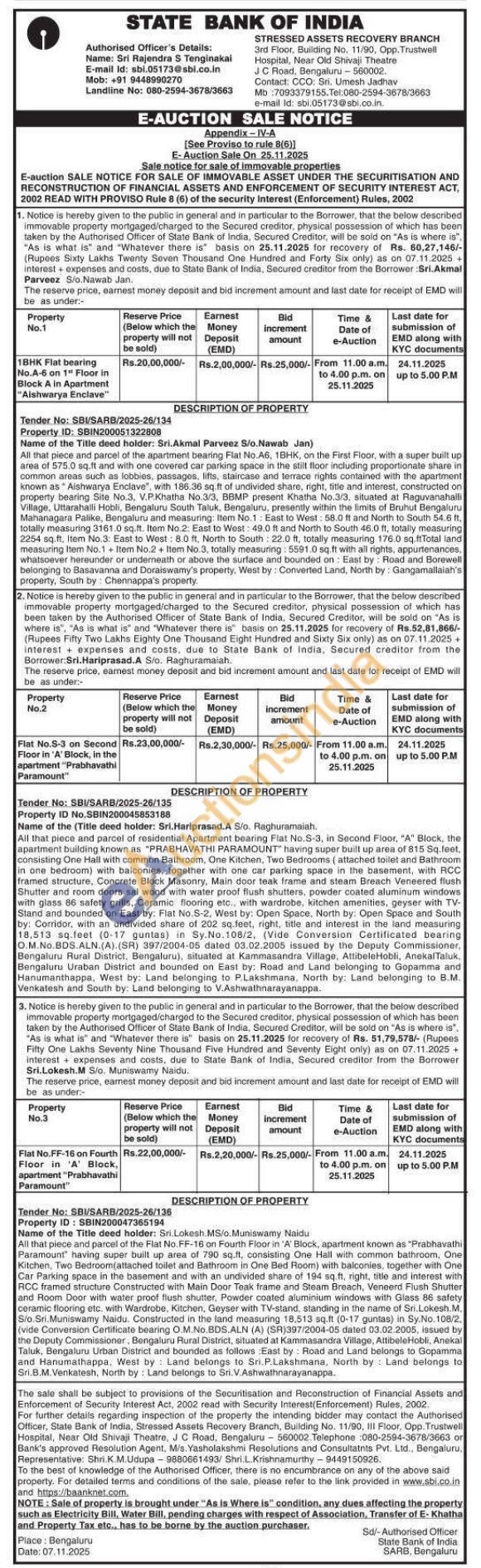 All that piece and parcel of the apartment bearing Flat No.A6, 1BHK, on the First Floor, with a super built up area of 575.0 sq.ft and with one covered car parking space in the stilt floor including proportionate share in common areas such as lobbies, passages, lifts, staircase and terrace rights contained with the apartment known as Aishwarya Enclave", with 186.36 sq.ft of undivided share, right, title and interest, constructed on property bearing Site No.3, V.P.Khatha No.3/3, BBMP present Khatha No.3/3, situated at Raguvanahalli Village, Uttarahalli Hobli, Bengaluru South Taluk, Bengaluru, presently within the limits of Bruhut Bengaluru Mahanagara Palike, Bengaluru and measuring: Item No.1 East to West: 58.0 ft and North to South 54.6 ft. totally measuring 3161.0 sq.ft. Item No.2: East to West: 49.0 ft and North to South 46.0 ft, totaliy measuring 2254 sq.ft. Item No.3: East to West: 8.0 ft, North to South: 22.0 ft, totally measuring 176.0 sq.ft Total land measuring Item No.1 + Item No.2 + Item No.3, totally measuring: 5591.0 sq.ft with all rights, appurtenances, whatsoever hereunder or underneath or above the surface and bounded on: East by Road and Borewell belonging to Basavanna and Doraiswamy's property, West by: Converted Land, North by: Gangamallaiah's property, South by: Chennappa's property.