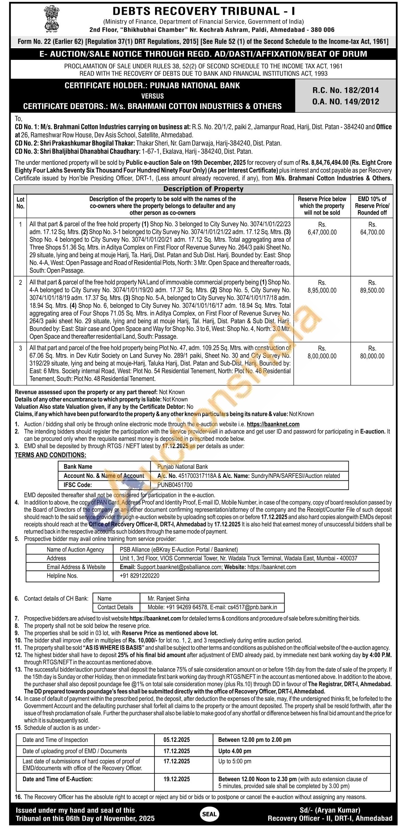 All that part & parcel of the free hold property (1) Shop No. 3 belonged to City Survey No. 3074/1/01/22/23 adm. 17.12 Sq. Mtrs. (2) Shop No. 3-1 belonged to City Survey No. 3074/1/01/21/22 adm. 17.12 Sq. Mtrs. (3) Shop No. 4 belonged to City Survey No. 3074/1/01/20/21 adm. 17.12 Sq. Mtrs. Total aggregating area of Three Shops 51.36 Sq. Mtrs. in Aditya Complex on First Floor of Revenue Survey No. 264/3 paiki Sheet No. 29 situate, lying and being at mouje Harij, Ta. Harij, Dist. Patan and Sub Dist. Harij. Bounded by: East: Shop No. 4-A, West: Open Passage and Road of Residential Plots, North: 3 Mtr. Open Space and thereafter roads, South: Open Passage.