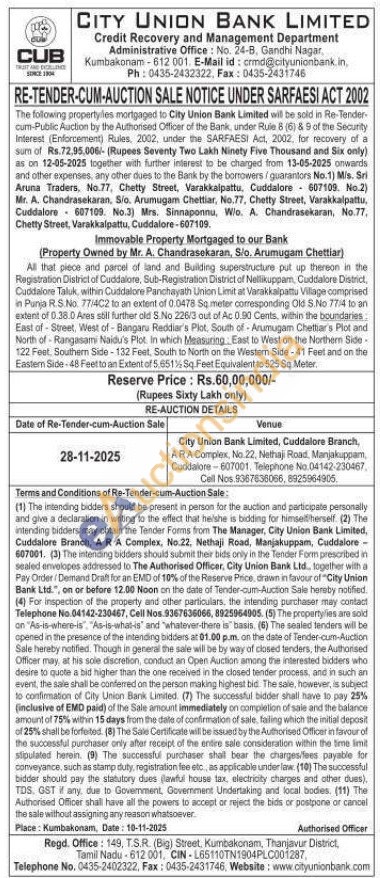 Immovable Property Mortgaged to our Bank (Property Owned by Mr. A. Chandrasekaran, Sio. Arumugam Chettiar): All that piece and parcel of land and Building superstructure put up thereon in the Registration District of Cuddalore, Sub-Registration District of Nellikuppam, Cuddalore District, Cuddalore Taluk, within Cuddalore Panchayath Union Limit at Varakkalpattu Village comprised in Punja R.S.No. 77/4C2 to an extent of 0.0478 Sq meter corresponding Old S.No 77/4 to an extent of 0.38.0 Ares still further old S.No 226/3 out of Ac 0.90 Cents, within the boundaries East of - Street, West of - Bangaru Reddiar's Plot, South of Arumugam Chettiar's Plot and North of - Rangasami Naidu's Plot. In which Measuring East to West on the Northern Side-122 Feet. Southern Side-132 Feet, South to North on the Western Side-41 Feet and on the Eastern Side-48 Feet to an Extent of 5.651 1/2 Sq Feet Equivalent to 525 Sq Meter