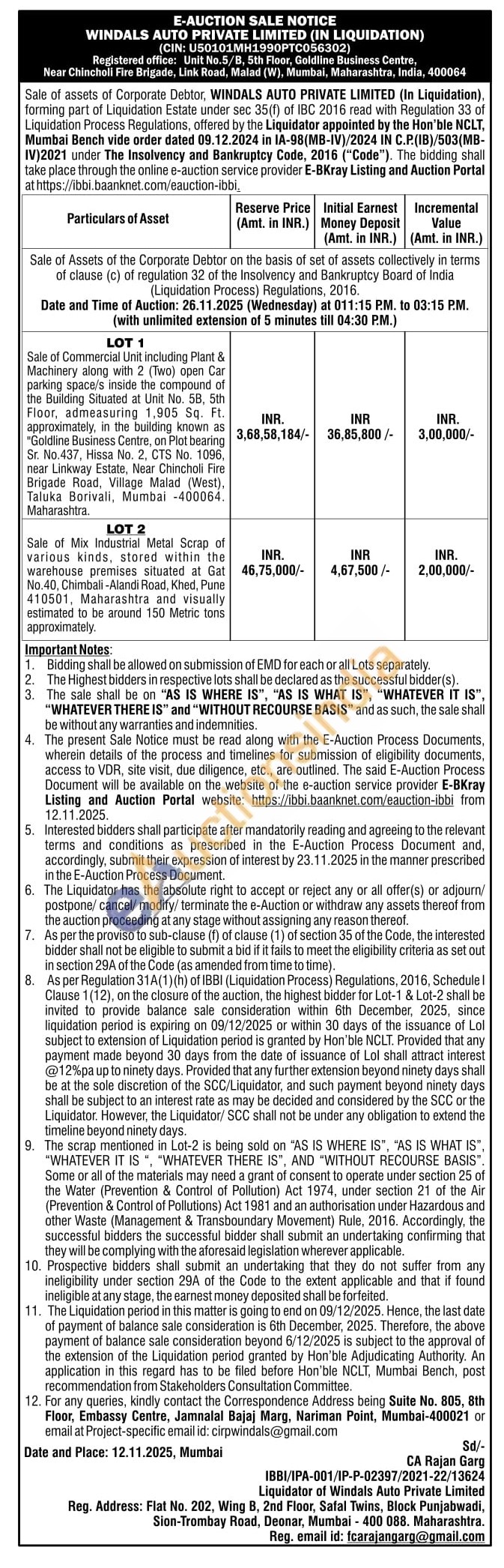 Sale of Commercial Unit including Plant & Machinery along with 2 (Two) open Car parking space/s inside the compound of the Building Situated at Unit No. 5B, 5th Floor, admeasuring 1,905 Sq. Ft.. approximately, in the building known as "Goldline Business Centre, on Plot bearing Sr. No.437, Hissa No. 2, CTS No. 1096, near Linkway Estate, Near Chincholi Fire Brigade Road, Village Malad (West), Taluka Borivali, Mumbai -400064. Maharashtra.