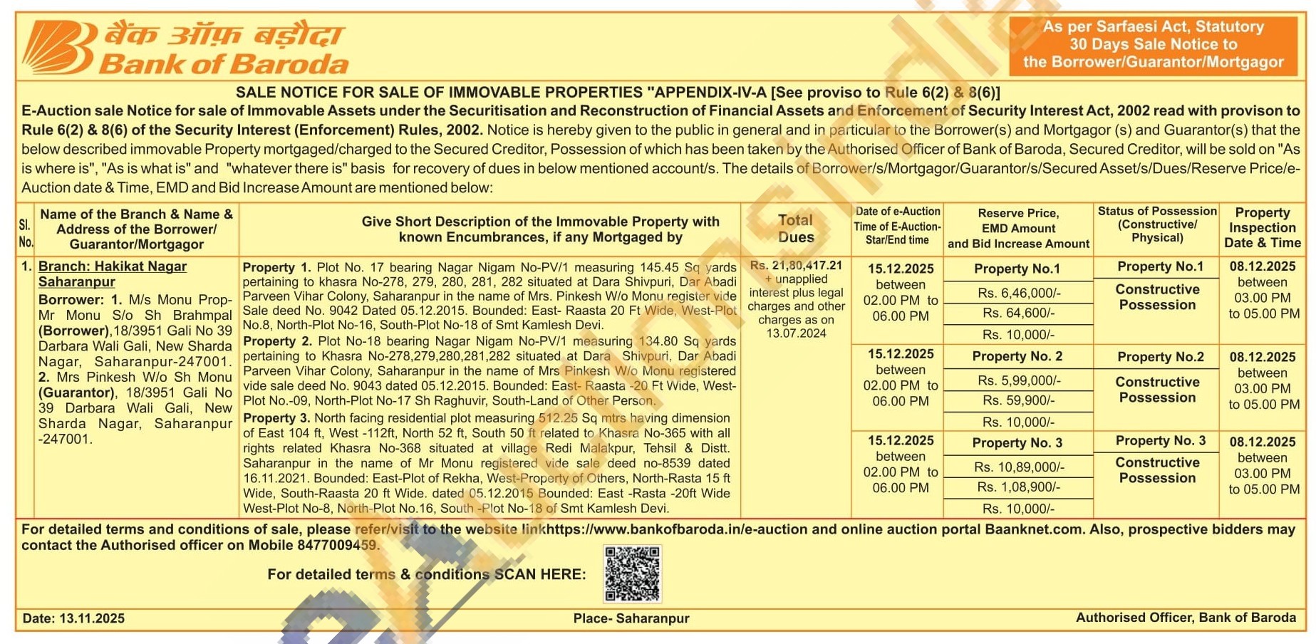 Property 3. North facing residential plot measuring 512.25 Sq mtrs having dimension of East 104 ft, West-112ft, North 52 ft, South 50 ft related to Khasra No-365 with all rights related Khasra No-368 situated at village Redi Malakpur, Tehsil & Distt. Saharanpur in the name of Mr Monu registered vide sale deed no-8539 dated 16.11.2021. Bounded: East-Plot of Rekha, West-Property of Others, North-Rasta 15 ft Wide, South-Raasta 20 ft Wide. dated 05.12.2015 Bounded: East -Rasta -20ft Wide West-Plot No-8, North-Plot No. 16, South -Plot No-18 of Smt Kamlesh Devi.