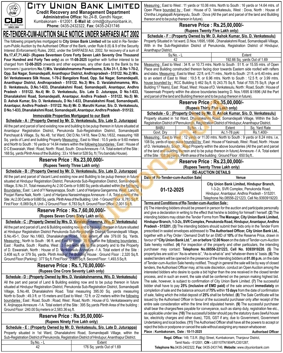 All the part and parcel of Vacant Land existing now and Building to be putup thereon in future situated at Hindupur Registration District, Penukonda Sub-Registration District, Somandepalli Village, S.No.31, Total measuring Ac 2.00 Cents or 9,680 Sq.yards situated within the following Boundaries: East: Land of Y Narayanappa, South: Land of Harijana Gangamma, West: Land of Poojari Rama Naik, North: Land of Harijana Narasimhappa Annexure -1 A. Total extent of the Site: Ac 2.00 Cents or 9,680 Sq. yards. Plinth Area of the Building: Unit-1 Ground Floor: 6,783 Sq.ft. First Floor: 6,069 Sq.ft. Unit-2 Ground Floor: 6,783 Sq.ft. Ground Floor Office: 2,001 Sq.ft.