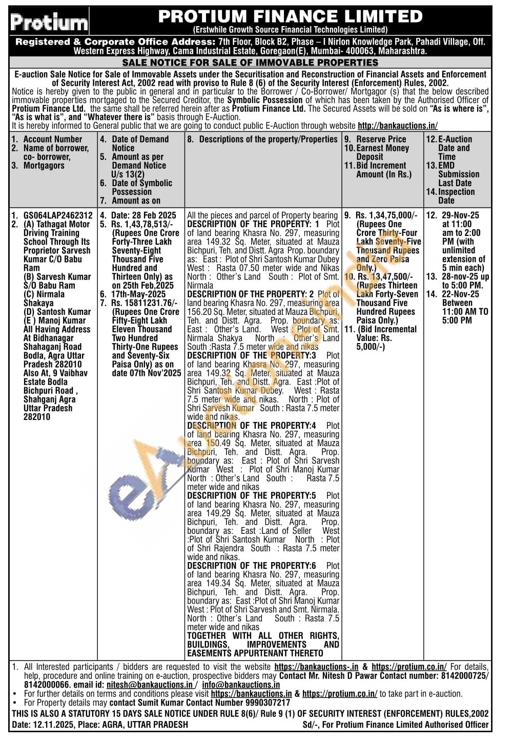 All the pieces and parcel of Property bearing 9 DESCRIPTION OF THE PROPERTY: 1 Plot of land bearing Khasra No. 297, measuring area 149.32 Sq. Meter, situated at Mauza Bichpuri, Teh. and Distt. Agra Prop. boundary as: East: Plot of Shri Santosh Kumar Dubey West: Rasta 07.50 meter wide and Nikas North Other's Land South Plot of Smt. Nirmala