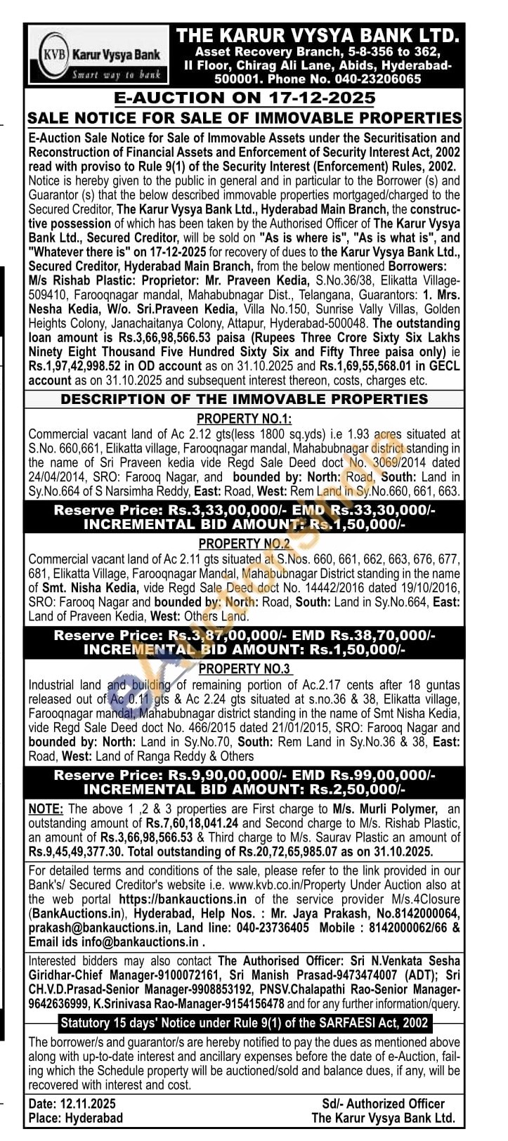 Commercial vacant land of Ac 2.11 gts situated at S.Nos. 660, 661, 662, 663, 676, 677, 681, Elikatta Village, Farooqnagar Mandal, Mahabubnagar District standing in the name of Smt. Nisha Kedia, vide Regd Sale Deed doct No. 14442/2016 dated 19/10/2016, SRO: Farooq Nagar and bounded by: North: Road, South: Land in Sy.No.664, East: Land of Praveen Kedia, West: Others Land.