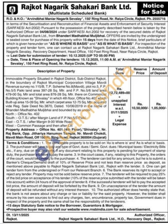 Immovable Property Situated in Rajkot District, Sub-District Rajkot, in the boundary of Rajkot Municipal Corporation Village Mavdi Revenue survey no. 115/B, T.P. Scheme No.8(Mavdi), plot no.5, F.P. No.5/5 Paiki land area 397-28 Sq. Mtr. and F.P. No.5/6 land area 479-00 Sq. Mtr and total area 876-28 Sq. Mtr. there on Commercial Building Known as "Shivalay" in which 4th floor, Office No. 401 which Built-up area 15-09 Sq. Mtr. which carpet area 12-75 Sq. Mtr. acquired vide Reg. Sale Deed No.3870, Dated 10/06/2019 in the name of Bhanderi Madhabhai Muljibhai and bounded by as under:North: Office No. 402 South: O.T.S/after Margin Land of F.P.No.5/5 Paiki East: O.T.S./after Margin 9-00 Wide Road. West:-Common Passage and then after Lift Property Address: Office No. 401 (4th