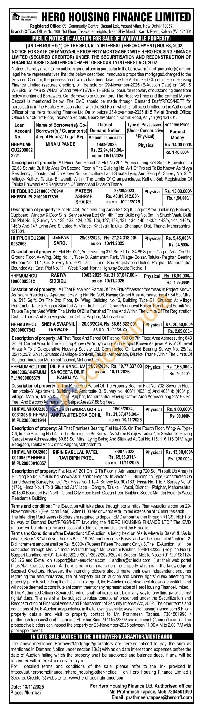 Description of property: Flat No. A/1201 On 12 Th Floor In Admeasuring 720 Sq. Ft (built Up Area) In Building No.04, Of Building Known As "rushabh Heights" In Sector-li, Building 1a Type, Constructed On Land Bearing Survey No. 9 (175), Hissa No. 1 To 4, Survey No. 90 (183), Hissa No. 1 To 7, Survey No. 91 (176), Hissa No. 1 To 3 Situated At Village - Dongre, Taluka - Vasai, District - Palghar, Maharashtra-401303 Bounded By: North: Global City Road East: Ocean Pearl Building South: Mandar Heights West: Residential Building