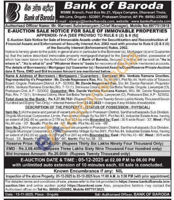 Item No.1: All the piece and parcel of vacant site property in Prakasam District, Santhanuthalapadu Sub Division, Ongole Municipal Corporation Limits, Pernamitta Village Sy No.99/1, Plot No. 43, Industrial Estate Area, having an extent of 242.00 sq yards or 2178 sq ftor 201 sq mirs Bounded by: East: 30 ft wide Road-33', West: Plot No.40 site-33', South: Plot No.44-66, North: Plot No.42 site-66 Item No.2: All the piece and parcel of vacant site property in Prakasam District, Santhanuthalapadu Sub Division, Ongole Municipal Corporation Limits, Pernamitta Village Sy.No.99/1, Plat No. 44, Industrial Estate Area, having an extent of 242.00 sq yards or 2178 sq.ft or 201 sq.mtrs Bounded by: East: Plot No. 43-66', West: 30 ft wide Road-33, South: Plot No.45 & 46-66', North: Plot No.39-33