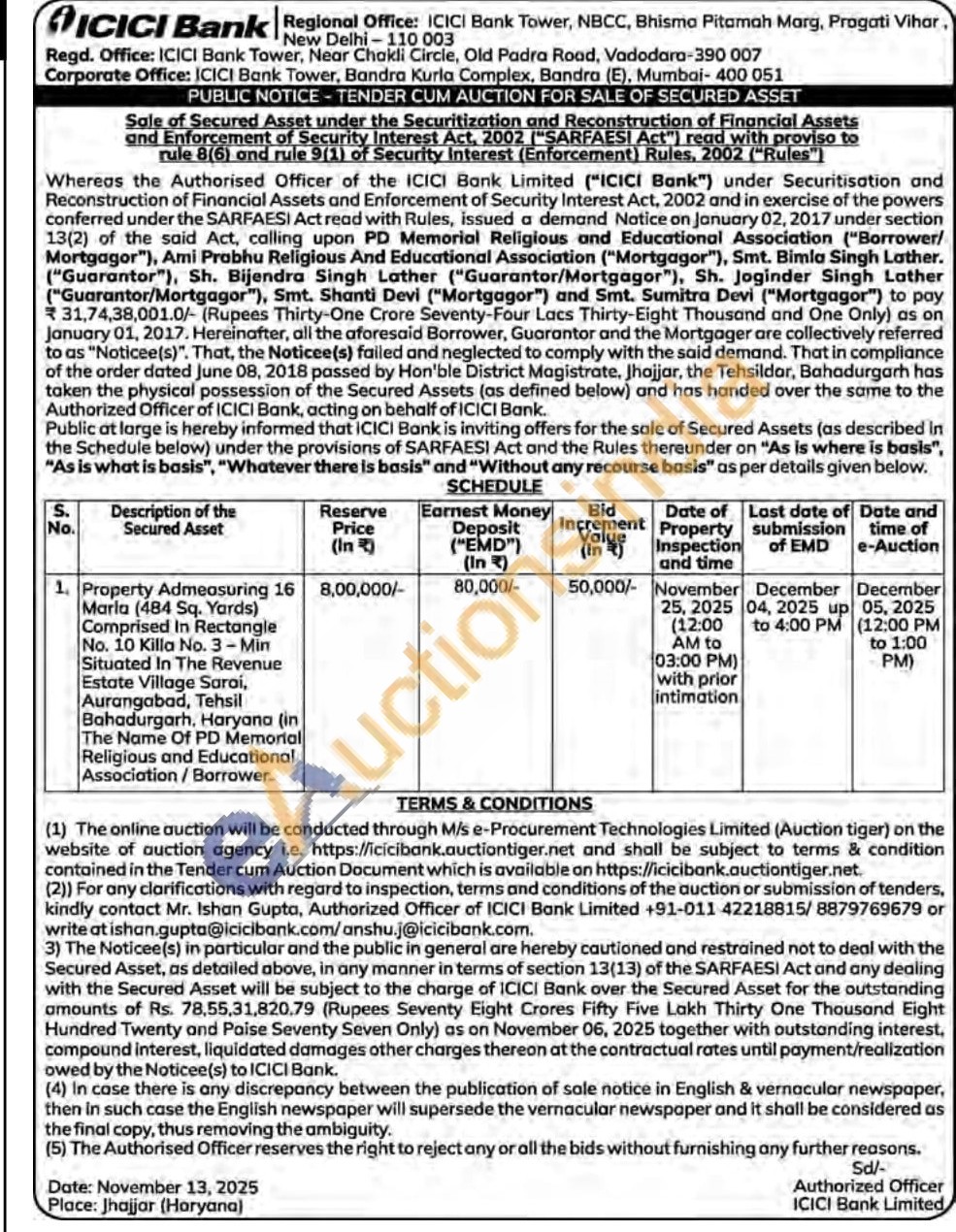 Property Admeasuring 16 Marla (484 Sq. Yards) Comprised In Rectangle No. 10 Killa No. 3-Min Situated In The Revenue Estate Village Sarai, Aurangabad, Tehsil Bahadurgarh, Haryana (in The Name Of PD Memorial Religious and Educational Association/Borrower