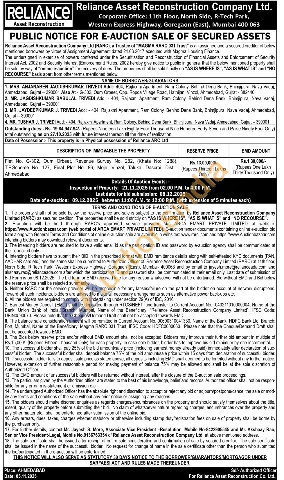 Flat No. G-302, Oum Orbeet, Revenue Survey No. 282, (Khata No: 1288), T.P.Scheme No. 127, Final Plot No. 86, Moje: Vinzol, Taluka: Dascroi, Dist Ahmedabad