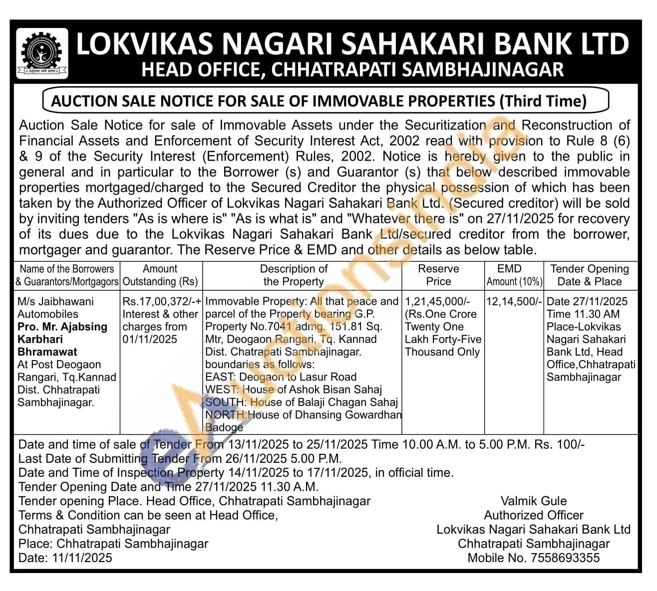 Immovable Property: All that peace and parcel of the Property bearing G.P. Mtr, Deogaon Rangari, Tq. Kannad Dist. Chatrapati Sambhajinagar. Property No.7041 admg. 151.81 Sq