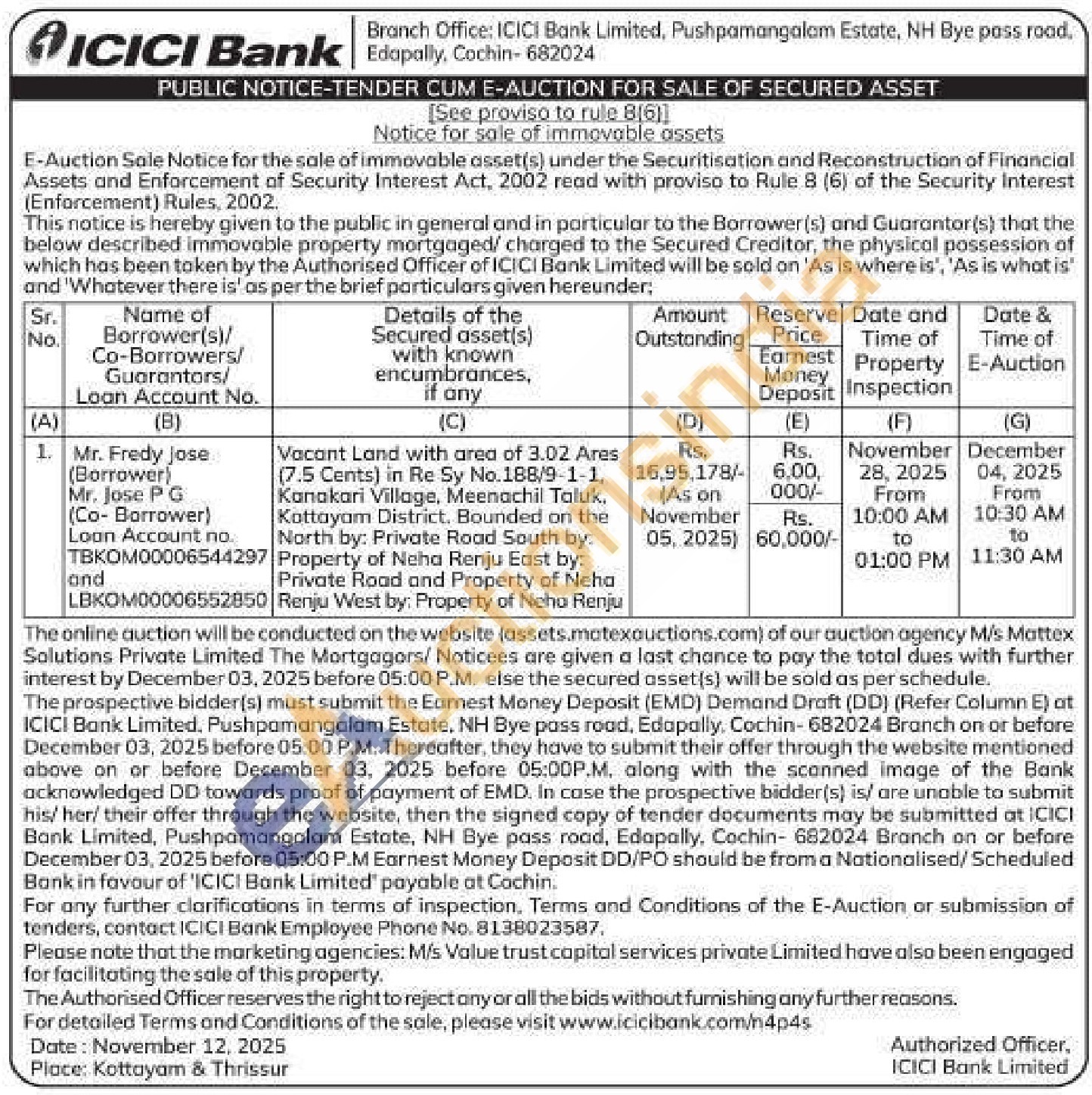 Vacant Land with area of 3.02 Ares (7.5 Cents) in Re Sy No.188/9-1-1, Kanakari Village, Meenachil Taluk. Kottayam District. Bounded on the North by: Private Road South by: Property of Neha Renju East by: Private Road and Property of Neha Renju West by: Property of Neha Renju