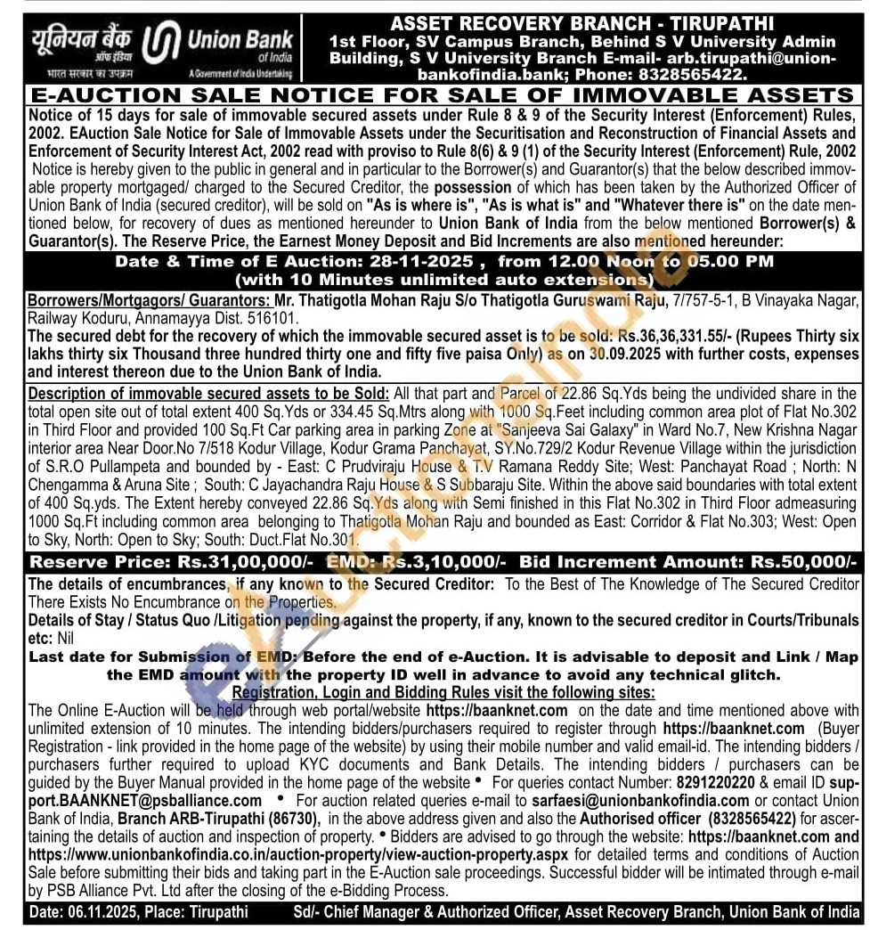 Description of immovable secured assets to be Sold: All that part and Parcel of 22.86 Sq. Yds being the undivided share in the total open site out of total extent 400 Sq. Yds or 334.45 Sq.Mtrs along with 1000 Sq. Feet including common area plot of Flat No.302 in Third Floor and provided 100 Sq.Ft Car parking area in parking Zone at "Sanjeeva Sai Galaxy" in Ward No.7, New Krishna Nagar interior area Near Door. No 7/518 Kodur Village, Kodur Grama Panchayat, SY.No. 729/2 Kodur Revenue Village within the jurisdiction of S.R.O Pullampeta and bounded by East: C Prudviraju House & T.V Ramana Reddy Site; West: Panchayat Road; North: N Chengamma & Aruna Site; South: C Jayachandra Raju House & S Subbaraju Site. Within the above said boundaries with total extent of 400 Sq.yds. The Extent hereby conveyed 22.86 Sq. Yds along with Semi finished in this Flat No.302 in Third Floor admeasuring 1000 Sq.Ft including common area belonging to Thatigotla Mohan Raju and bounded as East: Corridor & Flat No.303; West: Open to Sky, North: Open to Sky; South: Duct. Flat No.301.