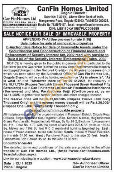 All that piece or parcel of the property situated in Prakasam District, Ongole Regi Division, Singarayakonda Sub-Registrar Office, Kondepi Mandal, Mugachinthala Grama Panchayathi, Mugachinthala Village, Sy No. 91-2, Block no. 1, Assessment по: 314, Door No. 1-79, with the extent of land area 225.5 Sq. yards or 189.42 Sq. Meters and 1308 Sq feet RCC residential building bounded by: East: House of Pokuri Aadaiah to this side 33 feet, South: House of Pokuri Peeraiah-to this side 61.06 feet West: Panchayat Road to this side 33 feet. North: Parabathina Siva Sankar House to this side 61.06 feet
