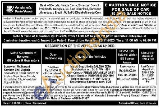 Maruti Suzuki India BALENO ZETA Registration no:-GJ-01-WH-1698 Body Colour:-PREME GRANDEUR GREY Chassis Number: MBHHWB13SN244501 Engine Number:-K12NP7126713 Encumbrance known to bank: BOB