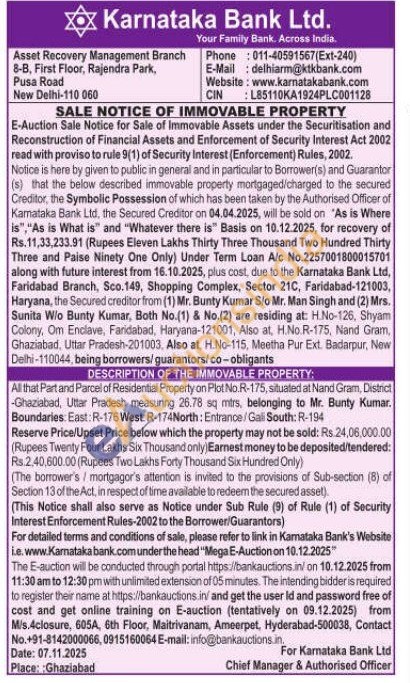 All that Part and Parcel of Residential Property on Plot No.R-175, situated at Nand Gram, District -Ghaziabad, Uttar Pradesh measuring 26.78 sq mirs, belonging to Mr. Bunty Kumar. Boundaries: East: R-176 West: R-174North: Entrance/Gali South: R-194