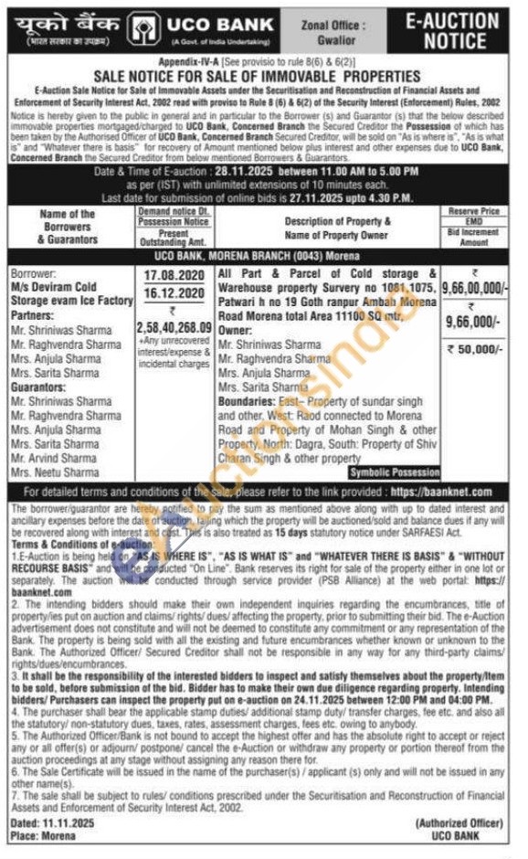 All Part & Parcel of Cold storage & Warehouse property Survery nо 1081,1075, Patwari h no 19 Goth ranpur Ambah Morena Read Morena total Area 11100 SQ mtr, Owner: Mr. Shriniwas Sharma Mr. Raghvendra Sharma Mrs. Anjula Sharma Mrs. Sarita Sharma Boundaries: East-Property of sundar singh and other, West: Raod connected to Morena Road and Property of Mohan Singh & other Property, North: Dagra, South: Property of Shiv Charan Singh & other property