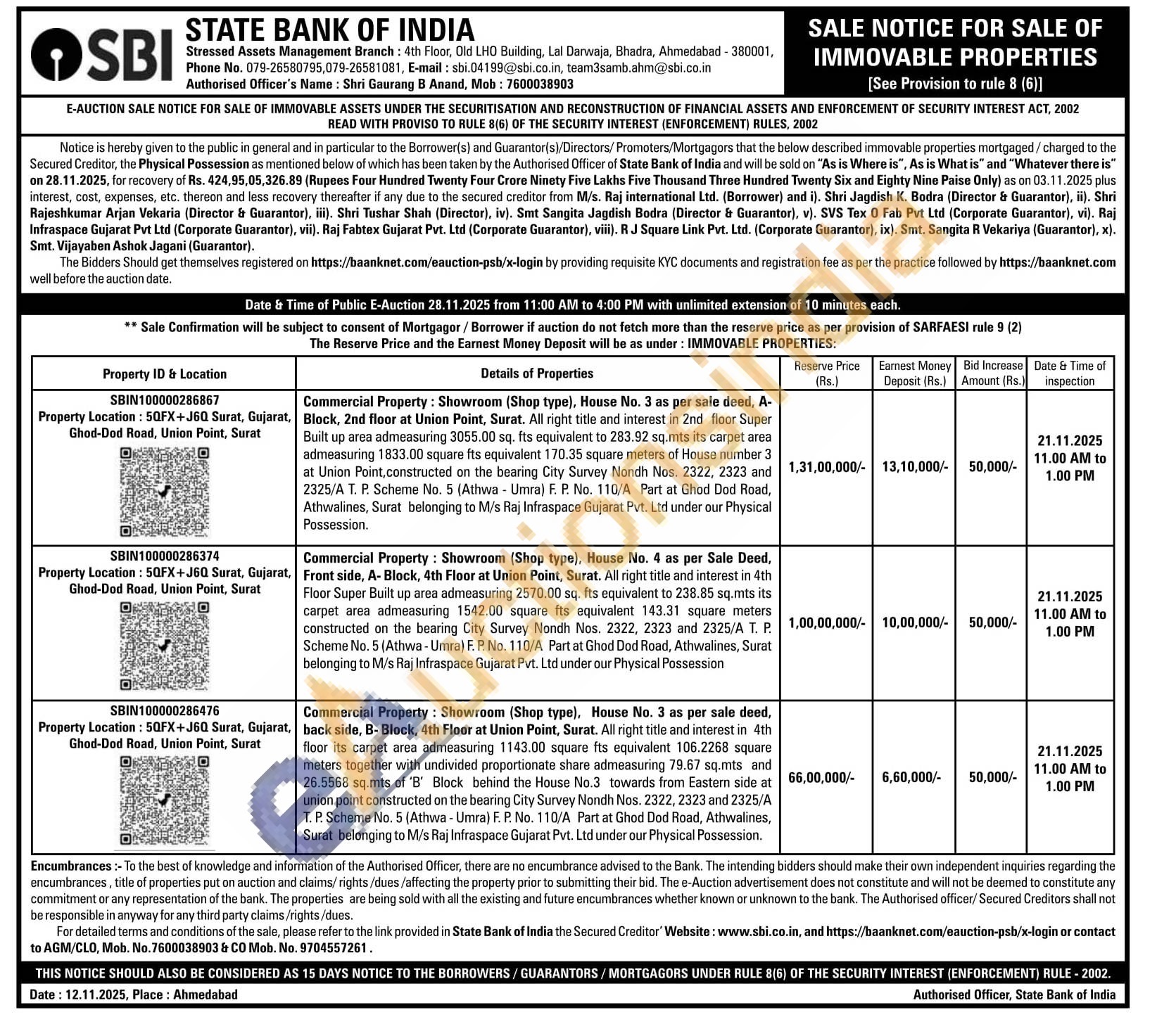 Commercial Property: Showroom (Shop type), House No. 3 as per sale deed, back side, B- Block, 4th Floor at Union Point, Surat. All right title and interest in 4th floor its carpet area admeasuring 1143.00 square fts equivalent 106.2268 square meters together with undivided proportionate share admeasuring 79.67 sq.mts and 26.5568 sq.mts of 'B' Block behind the House No.3 towards from Eastern side at union point constructed on the bearing City Survey Nondh Nos. 2322, 2323 and 2325/A T. P. Scheme No. 5 (Athwa - Umra) F. P. No. 110/A Part at Ghod Dod Road, Athwalines, Surat belonging to M/s Raj Infraspace Gujarat Pvt. Ltd under our Physical Possession.
