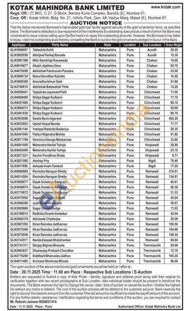 Kotak Mahindra Bank Gold Auctions Auction in Pune