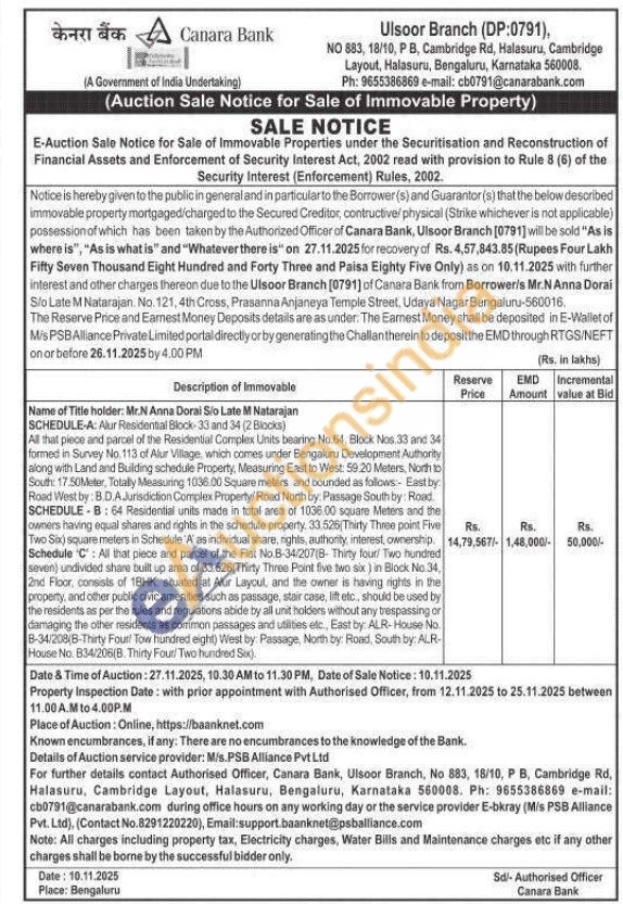 SCHEDULE-A: Alur Residential Block-33 and 34 (2 Blocks) All that piece and parcel of the Residential Complex Units bearing No.64, Block Nos 33 and 34 formed in Survey No. 113 of Alur Village, which comes under Bengaluru Development Authority along with Land and Building schedule Property, Measuring East to West: 59:20 Meters, North to South: 17.50 Meter, Totally Measuring 1036.00 Square meters and bounded as follows: East by Road West by: B.D.A Jurisdiction Complex Property/ Road North by: Passage South by Road SCHEDULE-B: 64 Residential units made in total area of 1036.00 square Meters and the owners having equal shares and rights in the schedule property. 33.525(Thirty Three point Five Two Six) square meters in Schedule 'A' as individual share, nights, authority, interest, ownership. Schedule 'C': All that piece and parcel of the Fiat No.B-34/20718-Thirty four/ Two hundred seven) undivided share built up area of 33.526(Thirty Three Point five two six) in Block No.34, 2nd Floor, consists of 18HK stuated at Aur Laycul, and the owner is having rights in the property, and other public civic amenities such as passage, stair case, lift etc., should be used by the residents as per the rules and regulations abide by all unit holders without any trespassing or damaging the other residents as common passages and utilities elc., East by: ALR-House No. B-34/208(B-Thirty Four/ Tow hundred eight) West by: Passage, North by: Road, South by: ALR-House No. 834/206(B. Thirty Four/Two hundred Six).