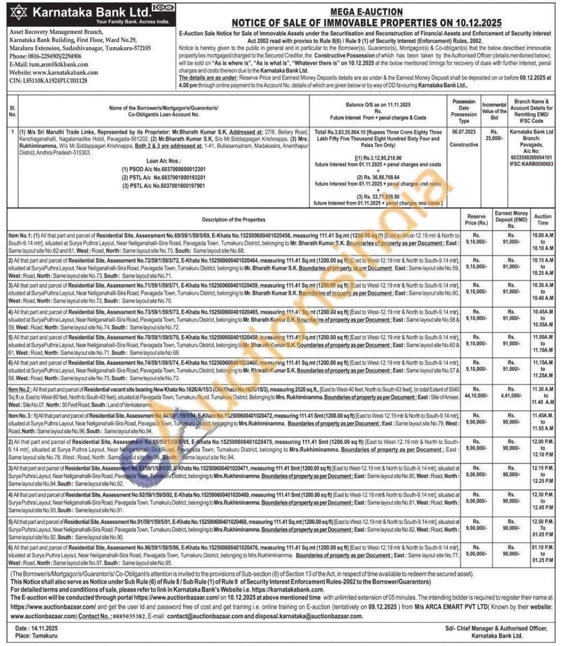 2) All that part and parcel of Residential Site, Assessment No. 72/59/1/59/5/72, E-Khata No. 152500600401020464, measuring 111.41 Sq.mt (1200.00 sq ft) (East to West-12.19 mtr & North to South-9.14 mtr), situated at Surya Puthra Layout, Near Neliganahalli-Sira Road, Pavagada Town, Tumakuru District, belonging to Mr. Bharath Kumar S.K. Boundaries of property as per Document: East: Same layout site No.59, West: Road, North: Same layout site No.73, South: Same layout site No.71.