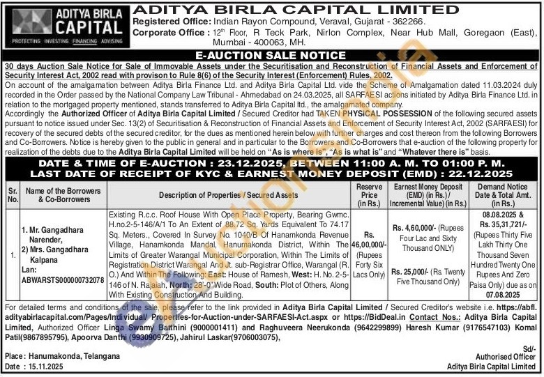 Authorized Officer Linga Swamy Batthini (Mobile No : 9000001411) / Raghuveera Neerukonda (Mobile No : 9642299899) / Haresh Kumar (Mobile No : 9176547103) / Komal Patil (9867895795)