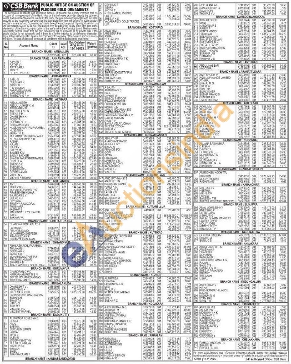 CSB Bank Gold Auctions Auction in Thrissur