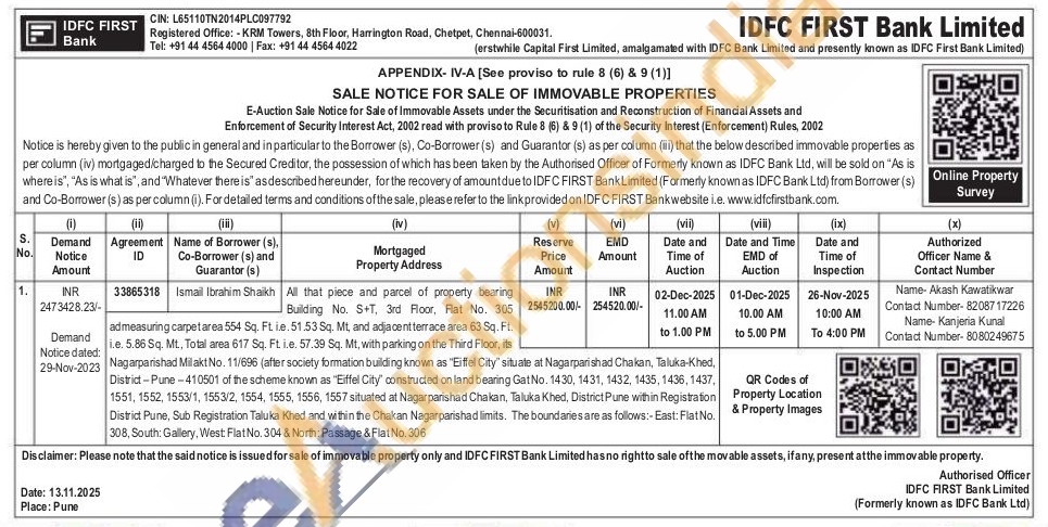 All that piece and parcel of property bearing Building No. S+T, 3rd Floor, Flat No. 305 admeasuring carpetarea 554 Sq. Ft ie. 51.53 Sq. Mt, and adjacent terrace area 63 Sq. Ft. I.e. 5.86 Sq. Mt, Total area 617 Sq. Ft. i.e. 57.39 Sq. Mt, with parking on the Third Floor, its Nagarparishad Milakt No. 11/696 (after society formation building known as "Eiffel City" situate at Nagarparishad Chakan, Taluka-Khed, District-Pune-410501 of the scheme known as "Eiffel City constructed on land bearing Gat No. 1430, 1431, 1432, 1435, 1436, 1437, 1551, 1552, 1553/1, 1553/2, 1554, 1555, 1556, 1557 situated at Nagarparishad Chakan, Taluka Khed, District Pune within Registration District Pune, Sub Registration Taluka Khed and within the Chakan Nagarparishad limits. The boundaries are as follows:-East: Flat No. 308, South: Gallery, West Flat No. 304 & North: Passage & Flat No. 306