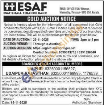 ESAF SMALL FINANCE BANK Gold Auctions Auction in Jaipur