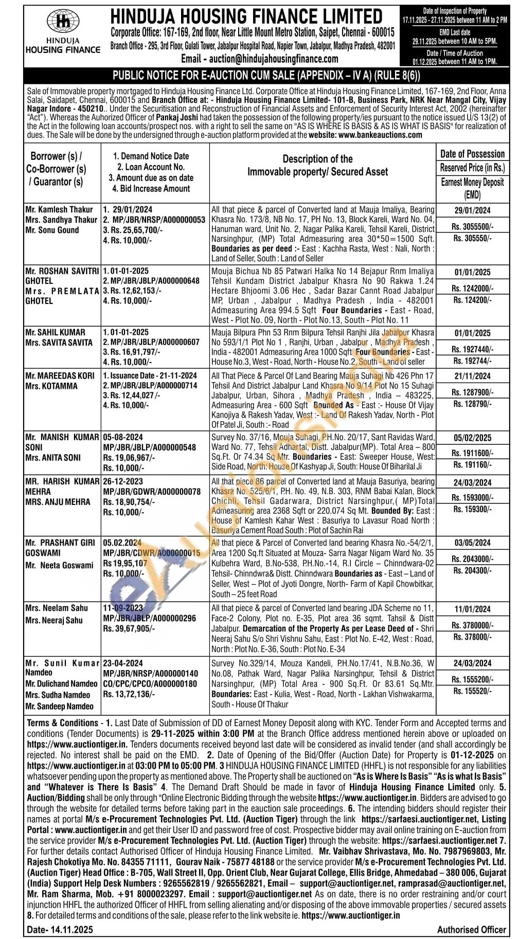 Contact Authorised Officer Mr. Vaibhav Shrivastava, Mo. No. 7987969803, Mr. Rajesh Chokotiya Mo. No. 84355 71111, Gourav Naik - 75877 48188