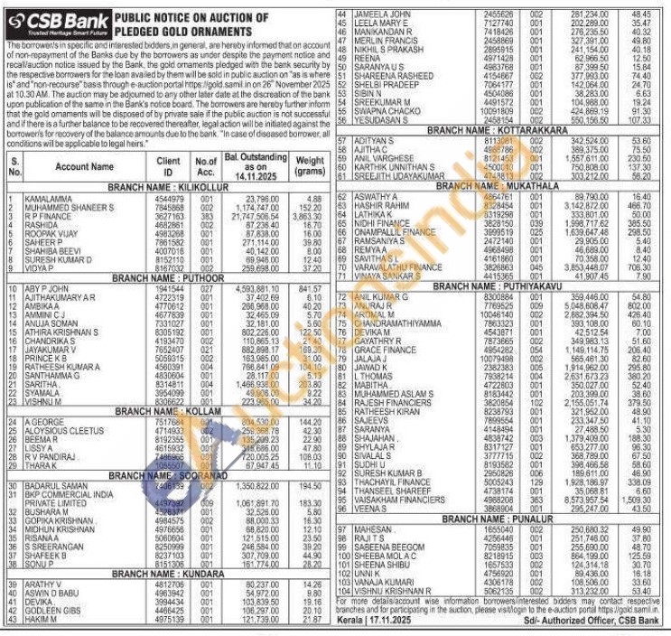 CSB Bank Gold Auctions Auction in Kollam
