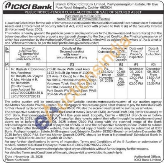 2 BHK House With Land Area 3122 In Built Up Area of 1100 In 2.9 Ares (7 Cents) In In Re Survey No. 90/1C, Nadakkuthazha Village Vatakara Taluk, Kozhikode District 673104. Bounded On The North: Park South: PWB Road East: PWB D14-56 West: Private Land