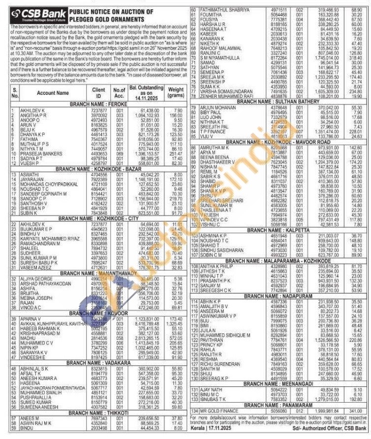 CSB Bank Gold Auctions Auction in Kozhikode