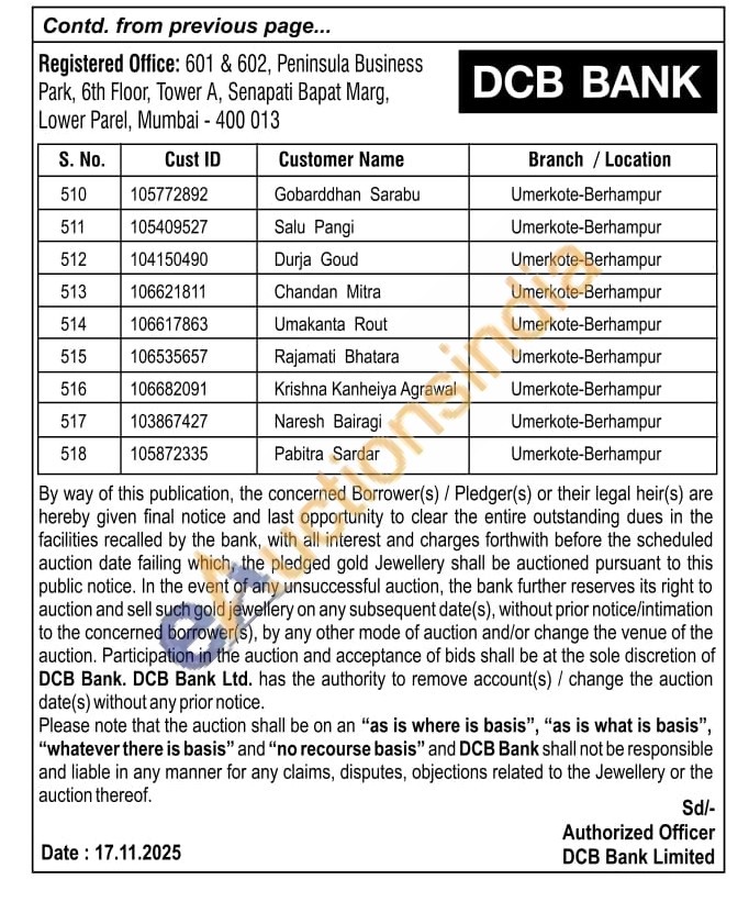DCB Bank Gold Auctions Auction in Bhubaneswar