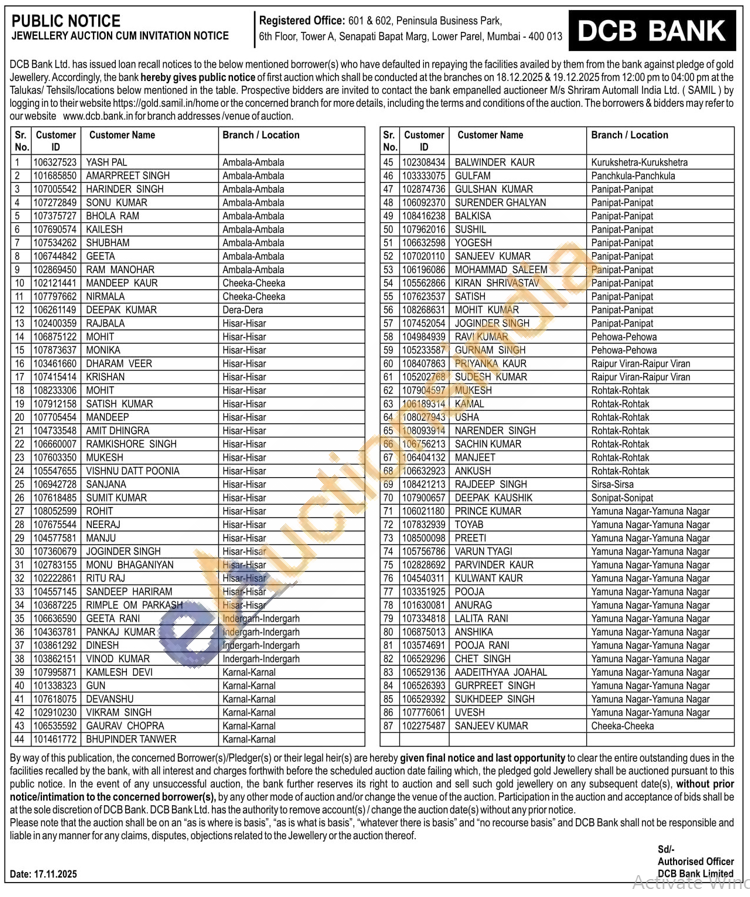 DCB Bank Gold Auctions Auction in Ambala