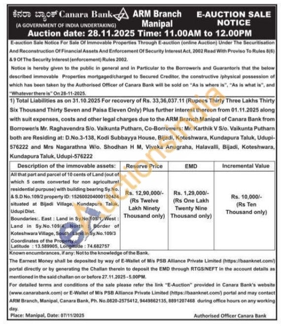 All that part and parcel of 10 cents of Land (out of which 5 cents converted for non agriculturel residential purpuse) with building bearing Sy.No. & S.D No.109/2 property ID: 152600204000120484 situated at Bijadi Village, Kundapura Taluk, Udupi Dist