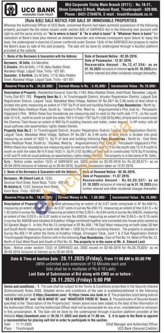 Description of Property: An area of land admeasuring an extent of Ac 0.07 cents comprised in SF No.458/10, measuring an extent of Hec 0.03.0 Ac 0.07 cents in survey No.458/1V, measuring an extent of Hec 0.61.5 Ac 1.52 cents in survey No.458/1W, measuring an extent of Hec 0.26.0-Ac 0.64 cents in survey No.458/2A, measuring an extent of Hec 0.03.0 Ac 0.07 cents in survey No.458/5A, measuring an extent of Hec 0.04.0 - Ac 0.10 cents in survey No.458/58 land situated at Kulathur Village combined together and converted into house plots named as Sri Ganesh Nagar II. In this Plot No.13 comprised in SF No.458/1W East West measuring on both sides 30 feet and South North measuring on both side 40 feet 1200 Sq Ft with a building thereon. The property is situated in Survey No.458/1 W within the limits of Kulathur Village, Srirangam Taluk, Joint 1 & 2 Sub Registration District Tiruchirappalli Registration District with in the following Four Boundaries: East of Plot No. 14, West of Plot No.12. North of East West Road and South of Plot No. 16. The property is in the name of Mr. A. Edward Lesli