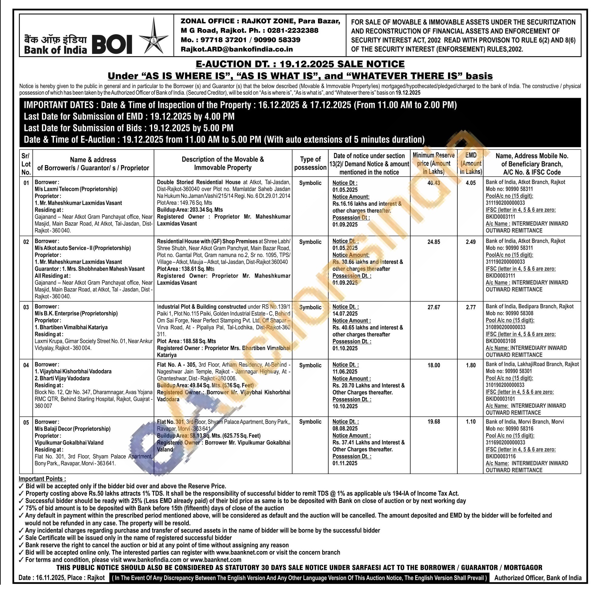 Industrial Plot & Building constructed under RS No. 139/1 Paiki 1, Plot No. 115 Paiki, Golden Industrial Estate-C, Behind Om Sai Forge, Near Perfect Stamping Pvt. Ltd, Off Shapar-Virva Road, At Pipaliya Pal, Tal-Lodhika, Dist-Rajkot-360 311.Plot Area: 188.58 Sq.mts Registered Owner: Proprietor Mrs. Bhartiben Vimalbhai Katariya