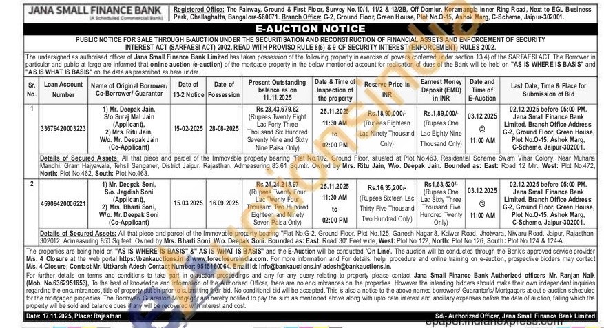 Details of Secured Assets: All that piece and parcel of the Immovable property bearing "Flat No.G-2, Ground Floor, Plat No.125, Ganesh Nagar 8, Kalwar Road, Jhotwara, Niwaru Road, Jaipur, Rajasthan-302012. Admeasuring 850 Sq.feet. Owned by Mrs. Bharti Soni, W/o. Deepak Soni. Bounded as: East: Road 30' Feet wide, West: Plot No. 122, North: Plot No.126, South: Plot No.124 & 124-A