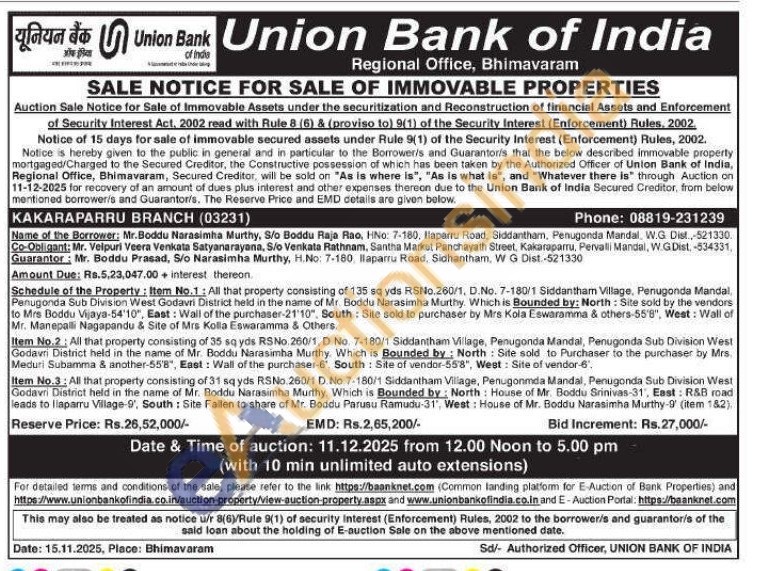 Schedule of the Property: Item No.1: All that property consisting of 135 sq yds RSNo.260/1, D.No. 7-180/1 Siddantham Village, Penugonda Mandal Penugonda Sub Division West Godavri District held in the name of Mr. Boddu Narasimha Murthy. Which is Bounded by: North: Site sold by the vendors to Mrs Boddu Vijaya-54'10", East: Wall of the purchaser-21'10", South: Site sold to purchaser by Mrs Kola Eswaramma & others-55'8", West: Wall of Mr. Manepalli Nagapandu & Site of Mrs Kolla Eswaramma & Others, Item No.2: All that property consisting of 35 sq yds RSNo. 260/1, D No. 7-180/1 Siddantham Village, Penugonda Mandal, Penugonda Sub Division West Godavni District held in the name of Mr. Boddu Narasimha Murthy. Which is Bounded by: North: Site sold to Purchaser to the purchaser by Mrs. Meduri Subamma & another-55'8", East: Wall of the purchaser-6, South Site of vendor-55'8", West: Site of vendor-6. Item No.3: All that property consisting of 31 sq yds RSNo.260/1 D. No.7-180/1 Siddantham Village, Penugonmda Mandal, Penugonda Sub Division West Godavri District held in the name of Mr. Boddu Narasimha Murthy. Which is Bounded by: North: House of Mr. Boddu Srinivas-31, East: R&B road leads to liaparru Village 9', South: Site Fallen to share of Mr. Boddu Parusu Ramudu-31", West: House of Mr. Boddu Narasimha Murthy-9 (item 182)