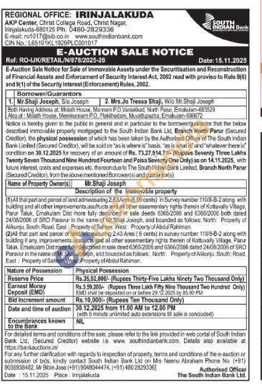 1)Al that part and parcel of land admeasuring 2.83.Ares (6.99 cents) in Survey number 110/8-8-2 along with building and all other improvements, usufructs and all other easementary rights therein of Kottuvally Village, Parur Taluk, Ernakulam Dist more fully described in sale deeds 6365/2006 and 6366/2006 both dated 24/08/2006 of SRO Paravur in the name of Mr.Shaji Joseph, and bounded as follows: North: Property of Alikunju. South Road. East: Property of Saheer. West: Property of Abdul Rahiman (2)All that part and parcel of land admeasuring 2.43 Ares (6 cents) in survey number 110/8-8-2 along with building if any, improvements usufructs and al other easementary rights therein of Kotluvally Village, Parur Taluk, Emakulam Dist more fully described in sale deed 6365/2006 and 6366/2006 dated 24/08/2006 of SRO Paravur in the name of Mr.Shaji Joseph, and bounded as follows: North: Property of Alikunju. South: Road. East: Property of Saheer. West: Property of Abdul Rahiman