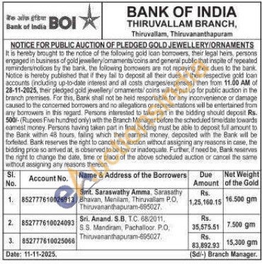 Bank of India Gold Auctions Auction in Thiruvananthapuram