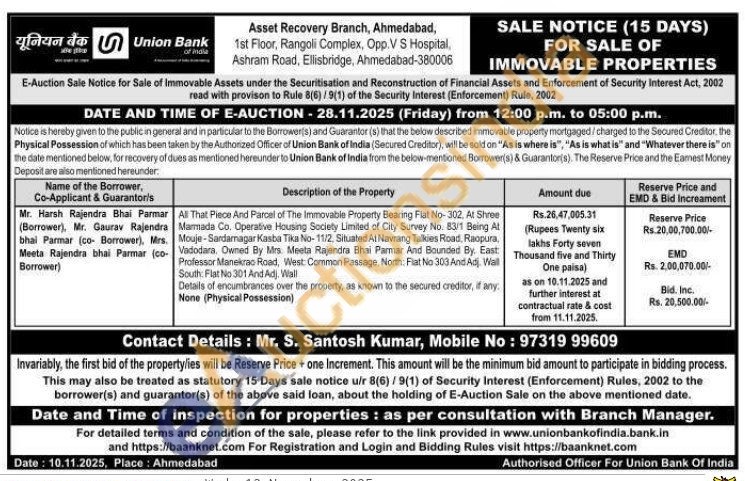 All That Piece And Parcel of The Immovable Property Bearing Fiat No-302. At Shree Marmada Co. Operative Housing Society Limited of City Survey No. 83/1 Being At Mouje-Sardarnagar Kasba Tika No- 11/2 Situated At Navrang Talkies Road, Raopura, Vadodara. Owned By Mrs. Meeta Rajendra Bhai Parmar And Bounded By. East: Professor Manekrao Road, West: Common Passage, North, Fiat No 303 And Adj. Wall South: Flat No 301 And Adj. WallDetails of encumbrances over the property, as known to the secured creditor, if any. None (Physical Possession)