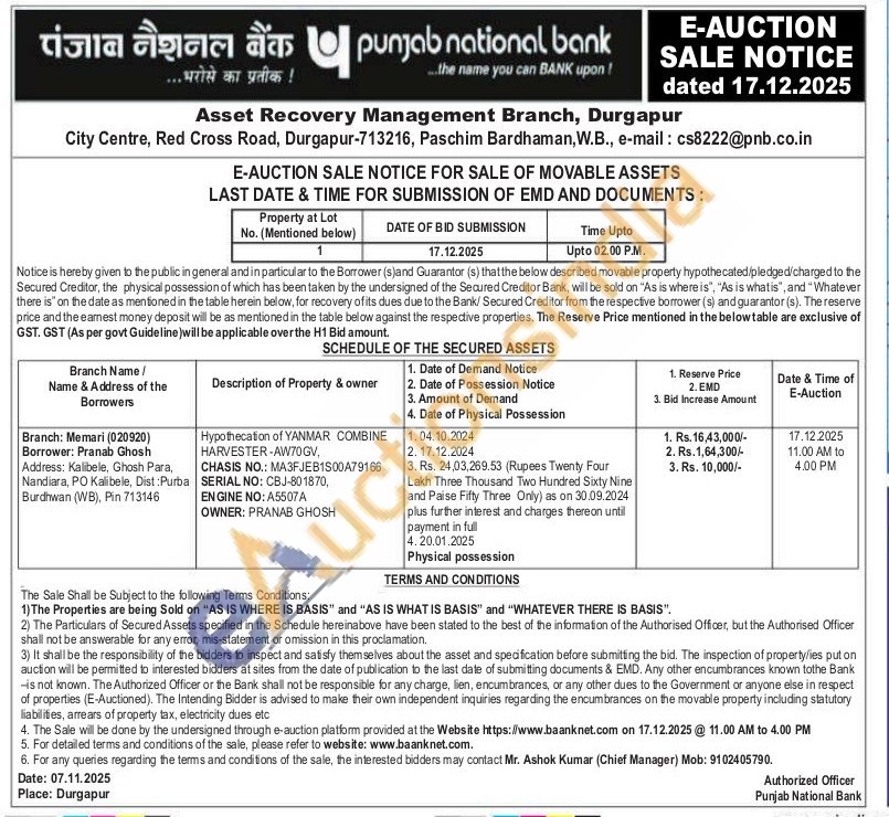 Hypothecation of YANMAR COMBINE HARVESTER-AW70GV, CHASIS NO.: MA3FJEB1S00A79166 SERIAL NO: CBJ-801870, ENGINE NO: A5507A OWNER: PRANAB GHOSH