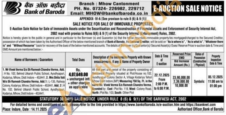 All that part and parcel of the property consisting of Residential Property situated at Plot/House no.102. Ayodhyapuri Colony Sector A. Village Kodariya Tehsil Mhow Distt Indore (MP) Measuring 750 Sq. Ft. in the name Mr. Vivek Verma S/o Ramesh Chandra Verma, Bounded by: East: Plot No. 119, West: Colony Road, North: Plot No. 103, South: Other Plot
