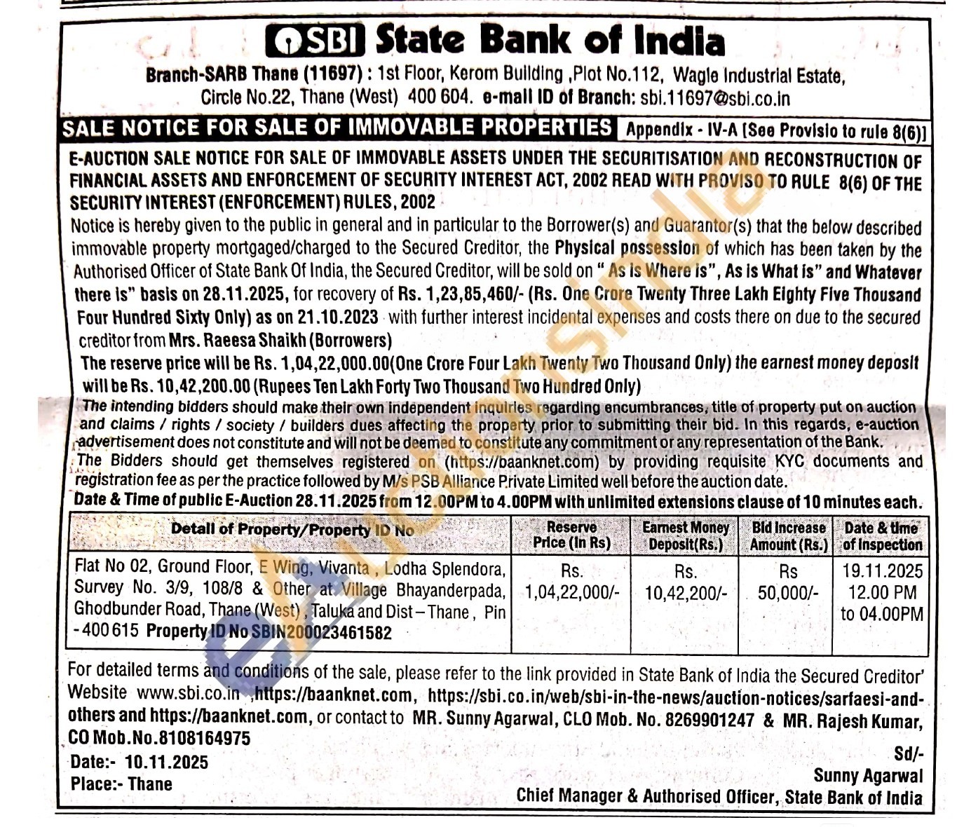 Flat No 02, Ground Floor, E Wing, Vivanta, Lodha Splendora, Survey No. 3/9, 108/8 & Other at Village Bhayanderpada, Ghodbunder Road, Thane (West), Taluka and Dist-Thane, Pin -400615 Property ID No SBIN200023461582