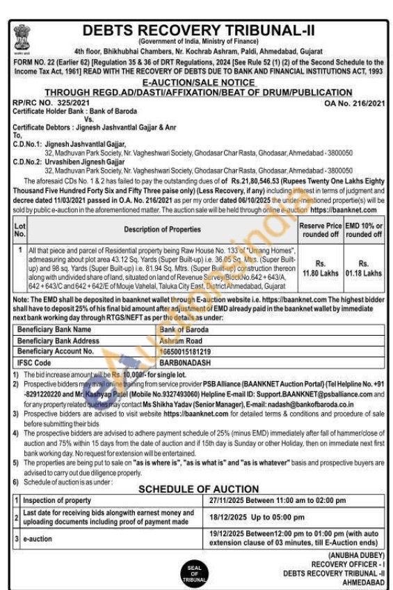 All that piece and parcel of Residential property being Raw House No. 133 of "Umang Homes", admeasuring about plot area 43.12 Sq. Yards (Super Built-up) ie. 36.05 Sq. Mtrs. (Super Built-up) and 98 sq. Yards (Super Built-up) ie. 81.94 Sq. Mtrs (Super Built-up) construction thereon along with undivided share of land, situated on land of Revenue Survey/BlockNo.642-643/A 642+643/C and 642+642/E of Mouje Vahelal, Taluka City East, District Ahmedabad, Gujarat