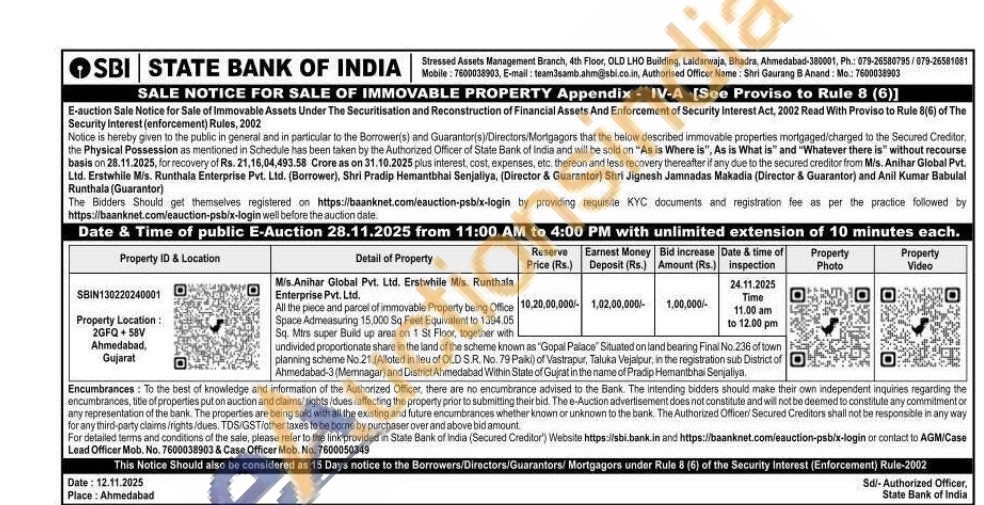 All the piece and parcel of immovable Property being Office Space Admeasuring 15,000 Sq Feet Equivalent to 1394.05 Sq. Mirs super Build up area on 1 St Floor, together with undivided proportionate share in the land of the scheme known as "Gopal Palace Situated on land bearing Final No. 236 of town planning scheme No. 21. (Alloted in lieu of OLD S.R. No. 79 Paiki) of Vastrapur, Taluka Vejalpur, in the registration sub District of Ahmedabad-3 (Memnagar) and District Ahmedabad Within State of Gujrat in the name of Pradip Hemantbhai Senjaliya.