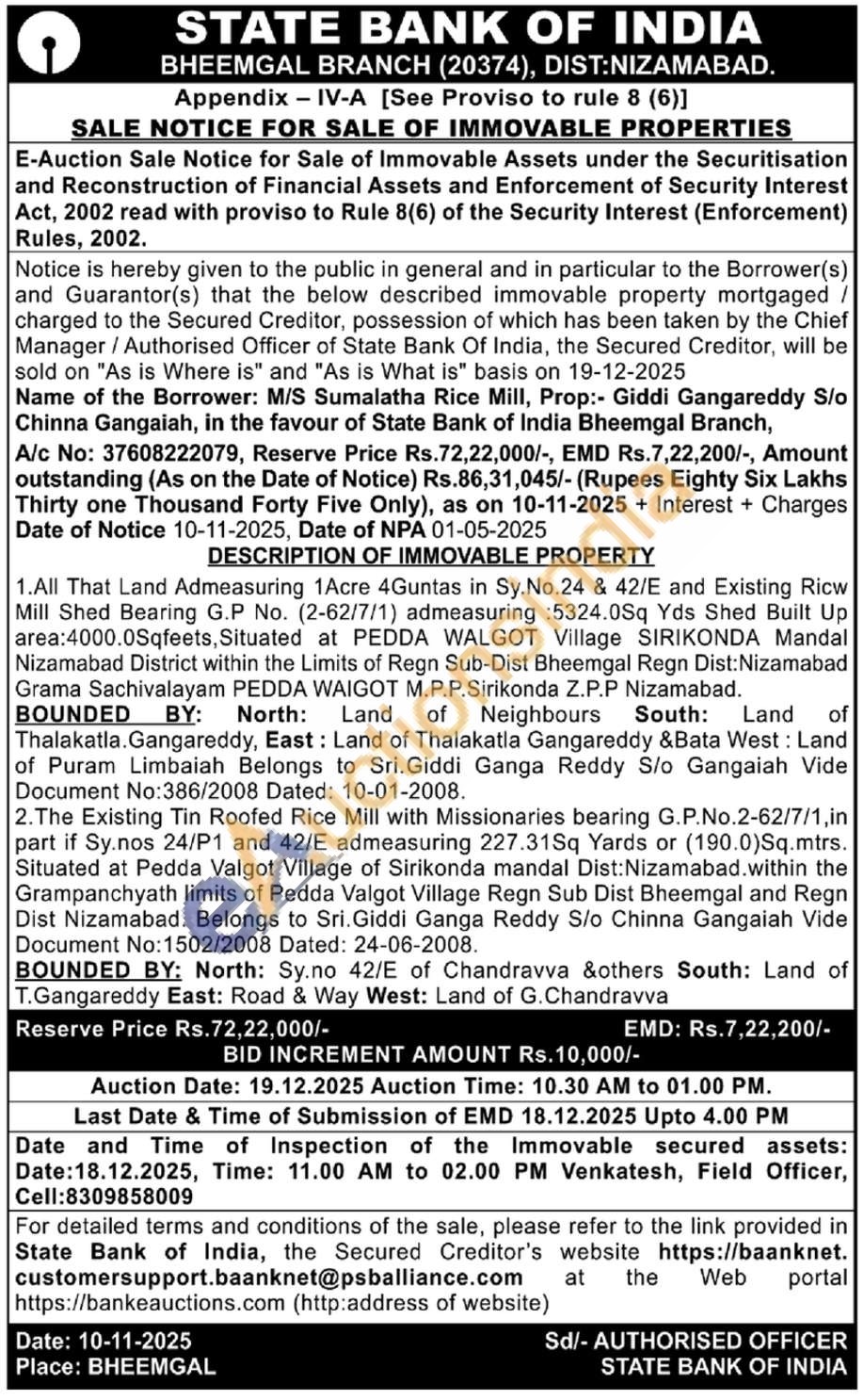 1.All That Land Admeasuring 1Acre 4Guntas in Sy.No.24 & 42/E and Existing Ricw Mill Shed Bearing G.P No. (2-62/7/1) admeasuring : 5324.0Sq Yds Shed Built Up area:4000.0Sqfeets, Situated at PEDDA WALGOT Village SIRIKONDA Mandal Nizamabad District within the Limits of Regn Sub-Dist Bheemgal Regn Dist: Nizamabad Grama Sachivalayam PEDDA WAIGOT M.P.P.Sirikonda Z.P.P Nizamabad. BOUNDED BY: North: Land of Neighbours South: Land Thalakatla.Gangareddy, East: Land of Thalakatla Gangareddy &Bata West: Land of Puram Limbaiah Belongs to Sri. Giddi Ganga Reddy S/o Gangaiah Vide Document No:386/2008 Dated: 10-01-2008. of 2. The Existing Tin Roofed Rice Mill with Missionaries bearing G.P.No.2-62/7/1,in part if Sy.nos 24/P1 and 42/E admeasuring 227.31Sq Yards or (190.0)Sq.mtrs. Situated at Pedda Valgot Village of Sirikonda mandal Dist: Nizamabad.within the Grampanchyath limits of Pedda Valgot Village Regn Sub Dist Bheemgal and Regn Dist Nizamabad. Belongs to Sri. Giddi Ganga Reddy S/o Chinna Gangaiah Vide Document No:1502/2008 Dated: 24-06-2008. BOUNDED BY: North: Sy.no 42/E of Chandravva &others South: Land of T.Gangareddy East: Road & Way West: Land of G. Chandravva
